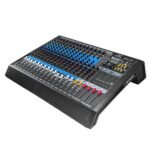 The 16-channel audio mixer is designed for professional live sound, recording, and PA applications. It features mic inputs via XLR and line inputs through 6.3mm jacks, with individual channel controls including gain, compression, hi, mid, mid frequency, low, aux1–4, FX1/FX2, pan, and master slide. Each channel includes 48V phantom and high-pass filter switches for versatile operation. The mixer offers LED bars for master and subgroup signal monitoring, a dual 48-bit DSP effects processor, dual 9-band graphic equalizers, and a digital audio port compatible with PC. Integrated MP3 player supports USB, Bluetooth, PC, and recording, providing flexible, all-in-one audio management.